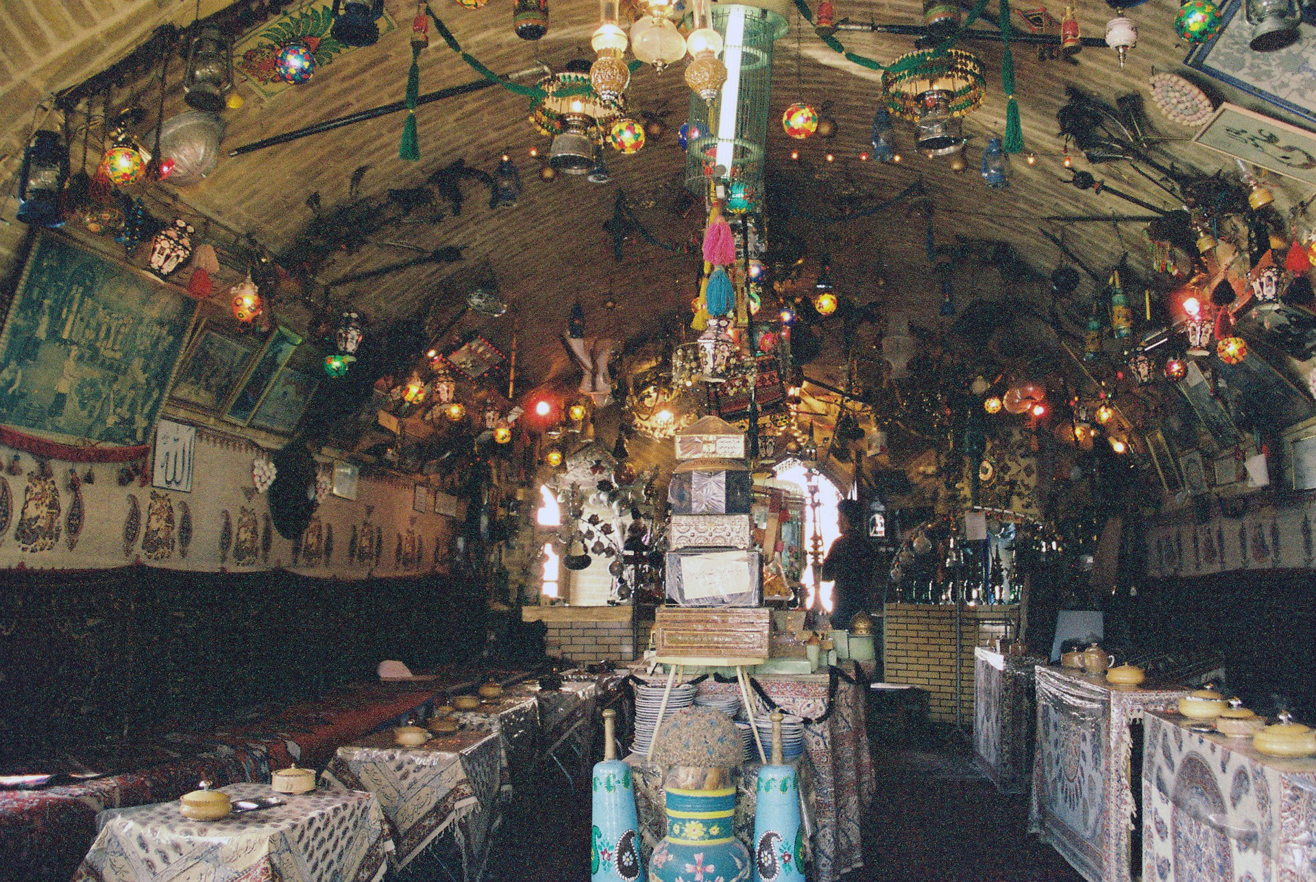 一旦、宿にもどって休憩して、クリスマスディナーへ。いくつかのレストランを覗いて、暖炉のある雰囲気のいいところへ。しっかりコース料理をいただいた。前菜はアーティチョーク、スタッフドナスのチーズ焼き(1650K ×2)、メインは、ナスとチーズの重ね焼きのベジメニュー(2300K)、チキンロールで野菜やライスが中に入っている(2600K)、さすが盛り付けもキレイで凝った味ですばらしい。デザートはトルコ伝統の細い生地をパリパリに揚げてはちみつにつけたもので、イラン・トルコ共通のピスタチオ入りの甘いケーキ(1250K)。ビール650K、フレッシュオレンジジュース850K、チップ込みでトータル12,000K。