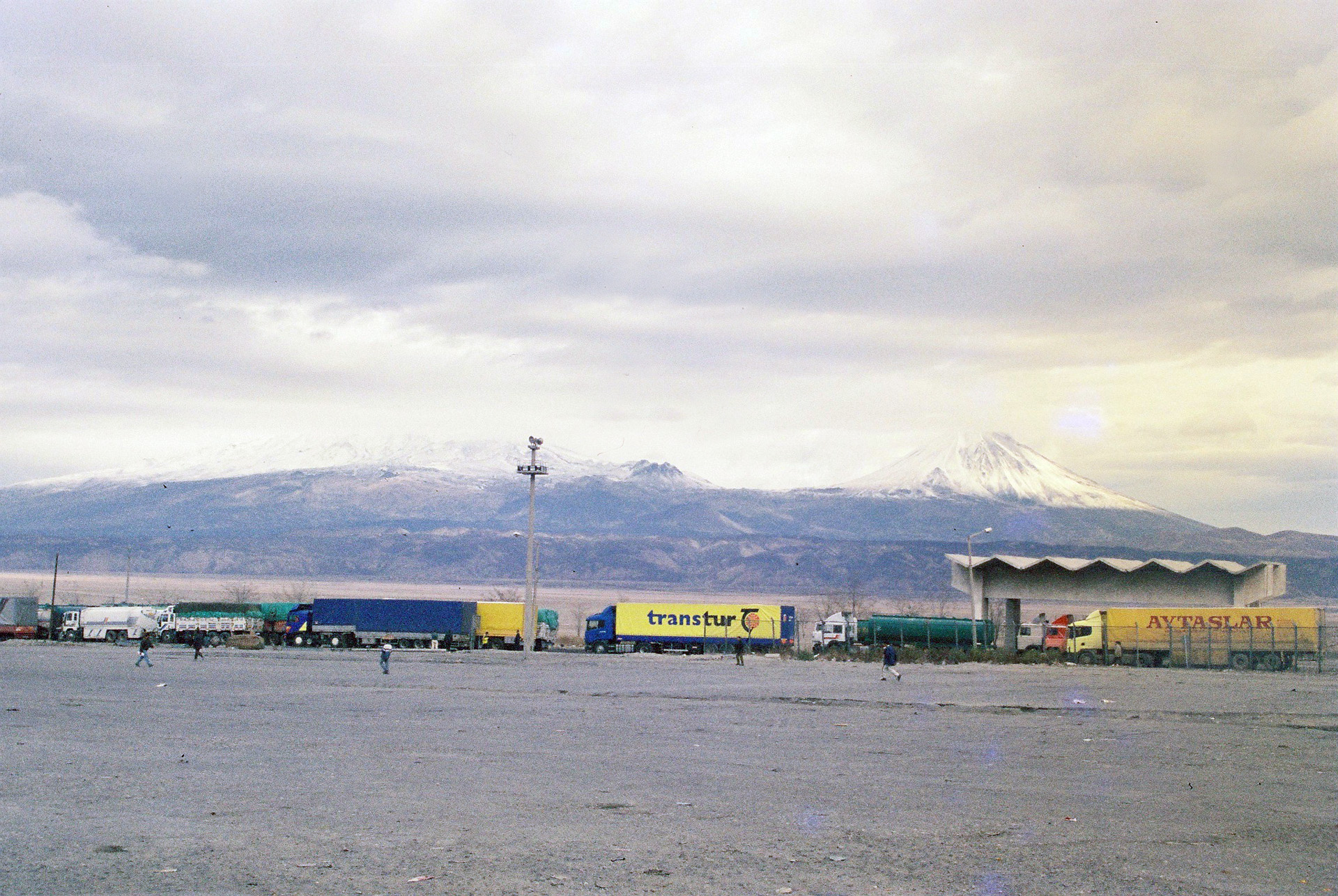 国境で行列を作るトラックたちと、右後ろの山は、アララット山。