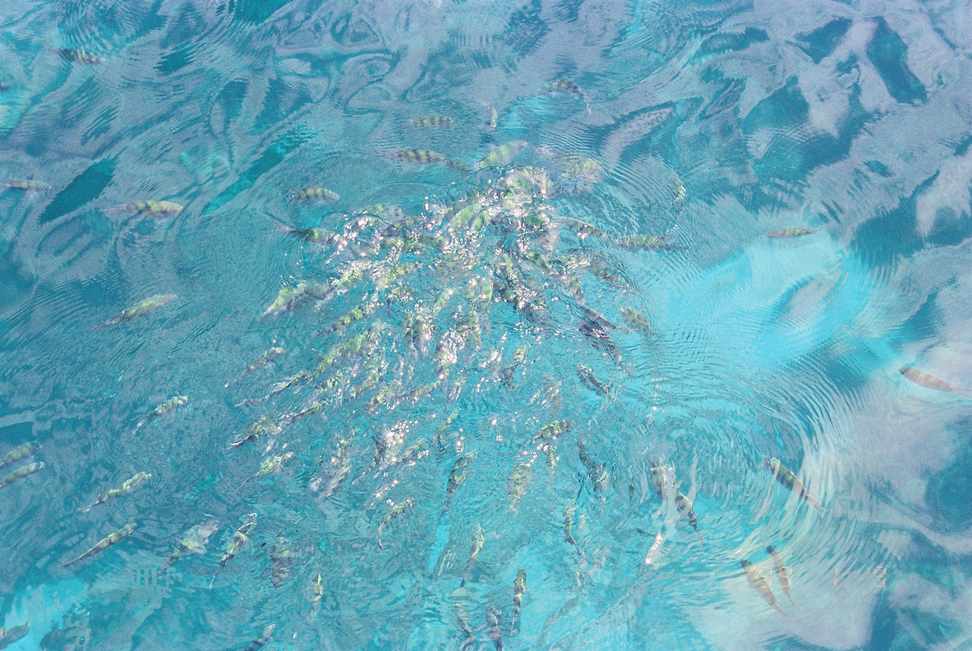 スノーケリングにパンを持っていったら、魚がすごい血相で集まってきて、オヤビッチャに間違えられて、肘をガブっとかじられた。
