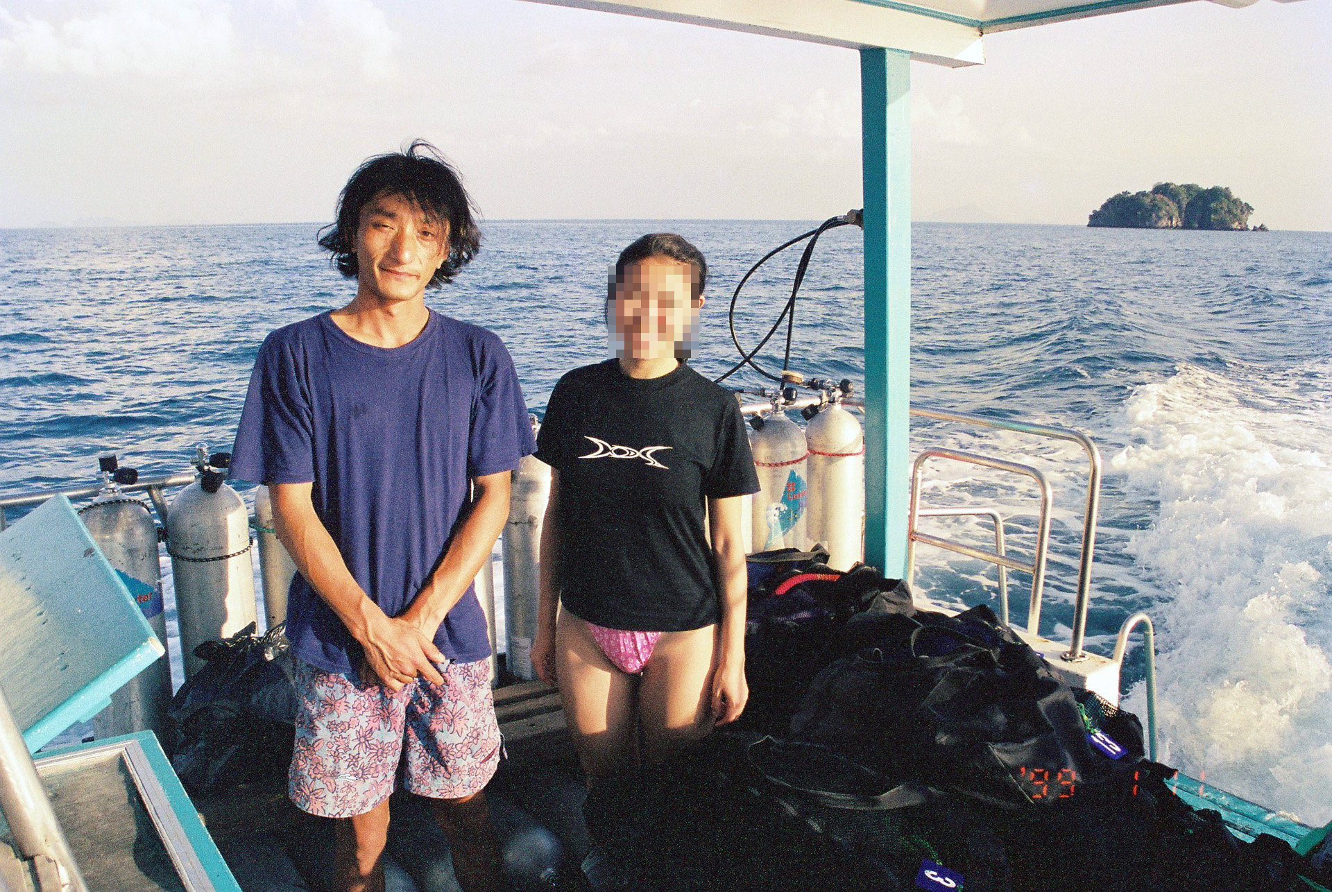 クロワッサン2個50Bと、屋台のフライドチキン2個30Bを買って、7時50分にダイビングショップに行き、8時に船に乗り込む。船の上で、クロワッサンで軽く朝食。イルカが泳いでいるのも見ることができた。海の中はやっぱり南国で、スノーケルでは見れない魚が見れた。コバンザメとか。船の上でBeerは50B。
