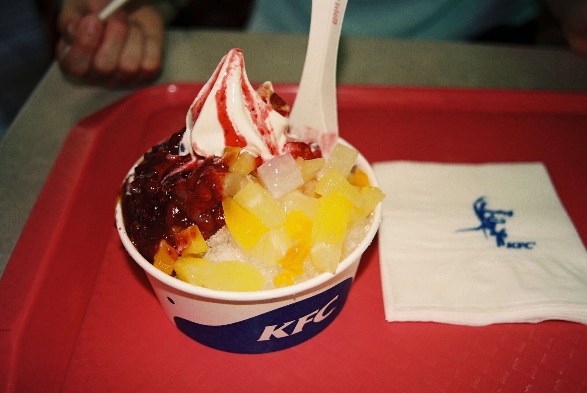 KFCにかき氷が売っていて、なんかこれがすごい。巨大なカップに、かき氷、フルーツ、ソフトクリーム、あずき、イチゴソースと、全部入りかき氷で、これは立派なデザートだ。日本の色付きシロップをかけたしょぼいかき氷とは全く違う概念の食べ物だ、美味しいし、幸せな気分。