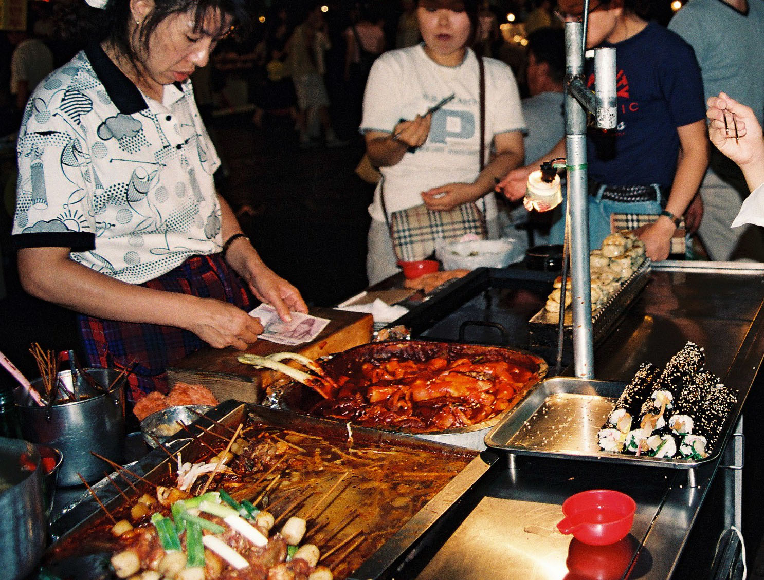 18時頃、夕食へ。夜はいろいろな屋台が出ていて、食べ歩きも楽しそうだけど、とりあえず焼き肉屋に。生カルビを注文すると、味付きではない立派な牛肉、お店の人がハサミでチョキチョキと切ってくれる。塩コショウを振ってサンチュで巻いていただく。味付きカルビの方も食べた。お腹いっぱい肉を食べて、ビールも飲んで、付け合わせもいろいろで、40,000₩。