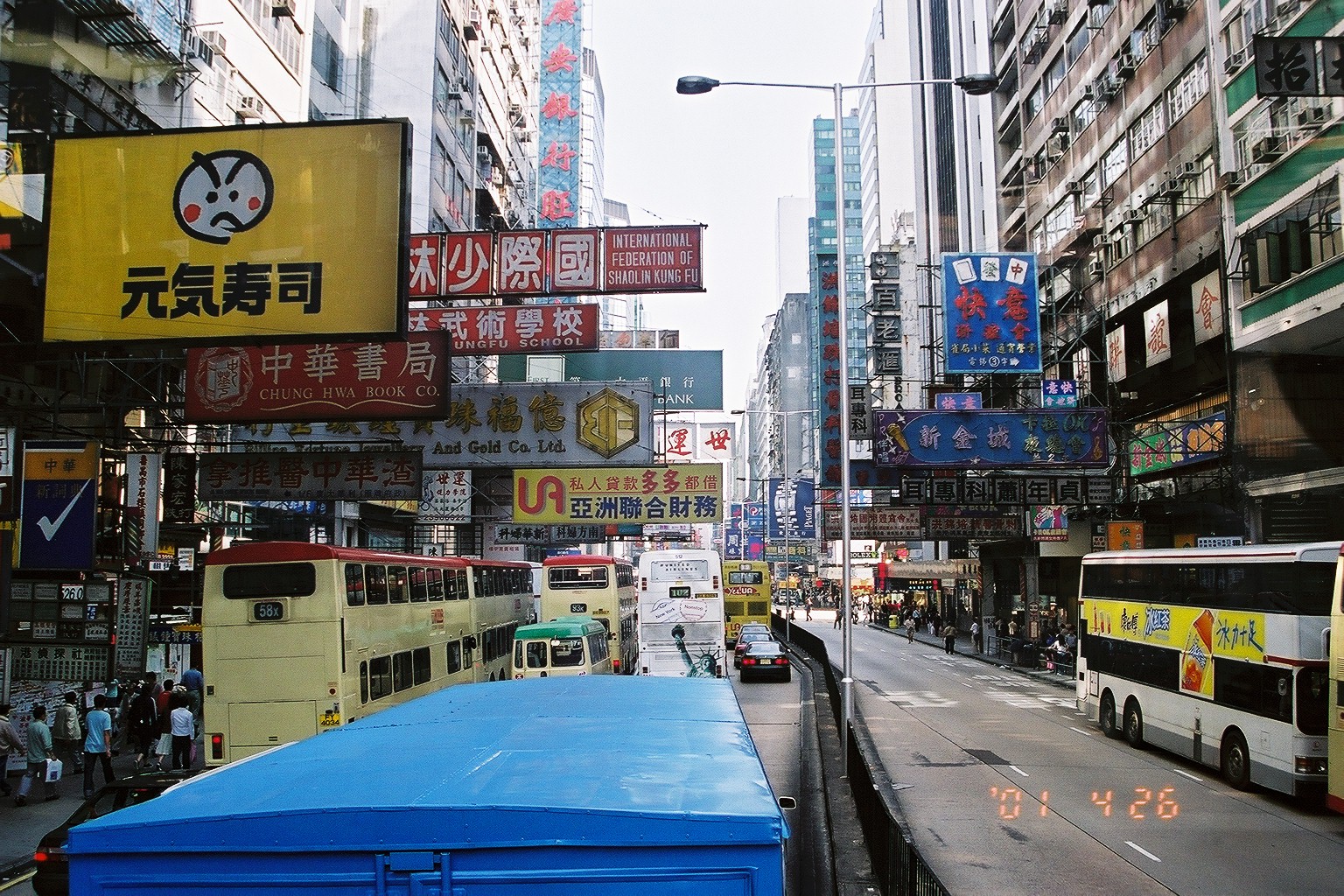 二階建てバスの2階最前列は面白い、頭のすぐ上を看板が通り抜けていく。おもわず、首をすくめたくなるレベル。