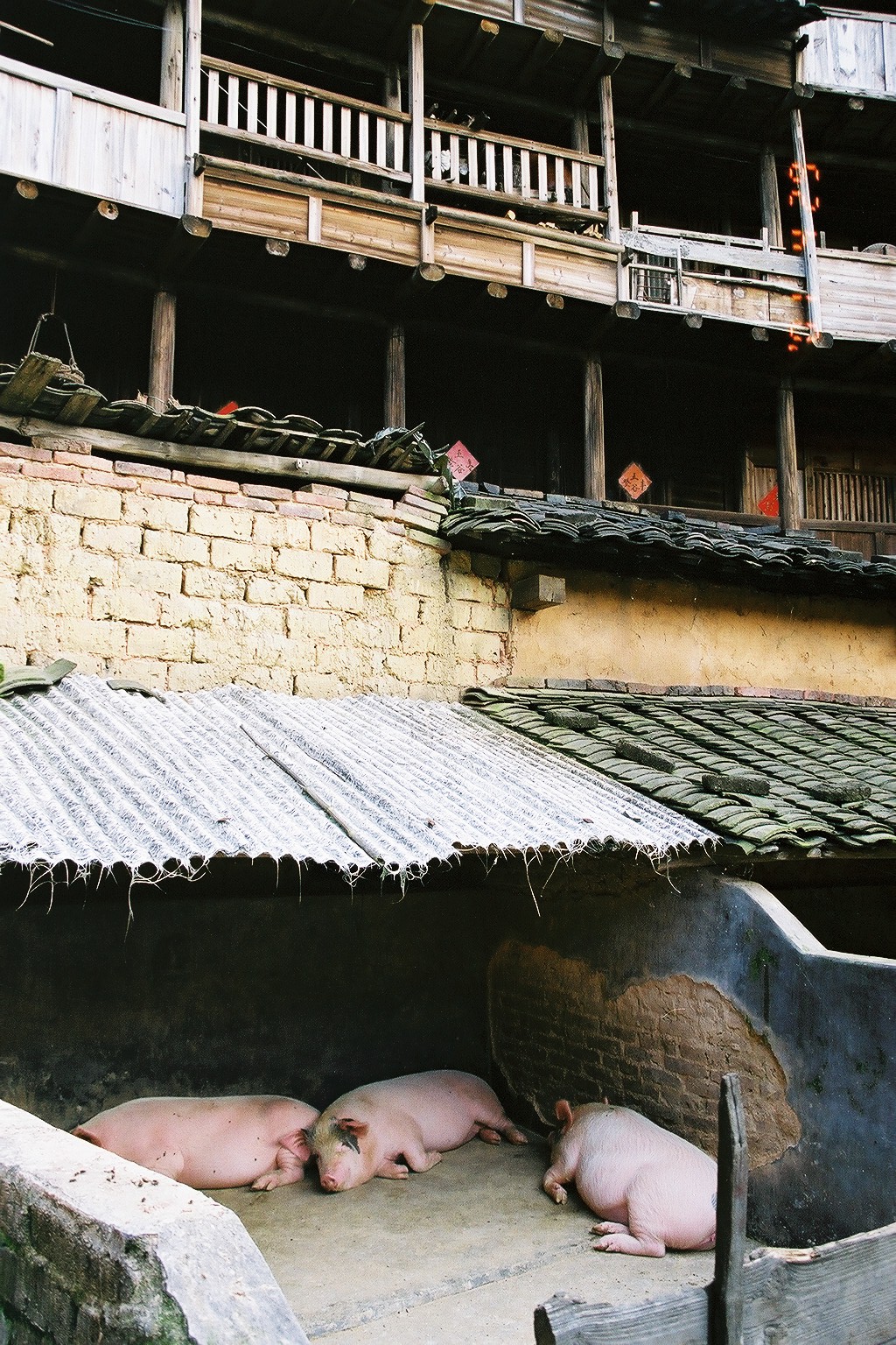 14時になり、高頭に移動、承啓楼に到着。承啓楼では、豚やアヒルやニワトリがうろうろしていて、振成楼より一層生活感のある円楼だ。