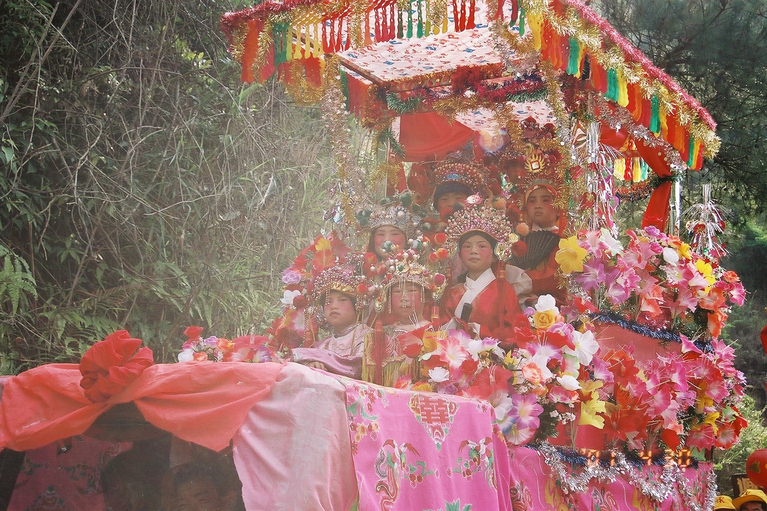 爆竹の煙で、かすむほど。こんな高いところにまつられている女の子も。衣装も凝っているし、本気のお祭りで迫力があるし、周囲の景色にもマッチしている。