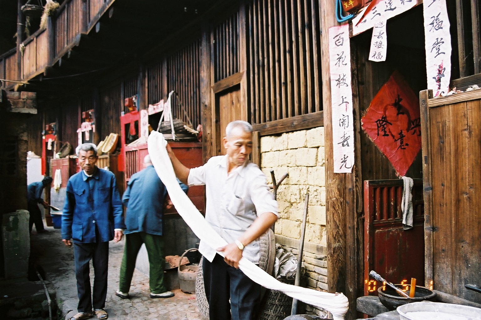 承啓楼に別れを告げる。朝はやくの出発だったので、家の人が朝食のかわりに弁当を作って持たせてくれた。ありがたい。朝はおじさんが、何かを伸ばしていた。麺?飴?