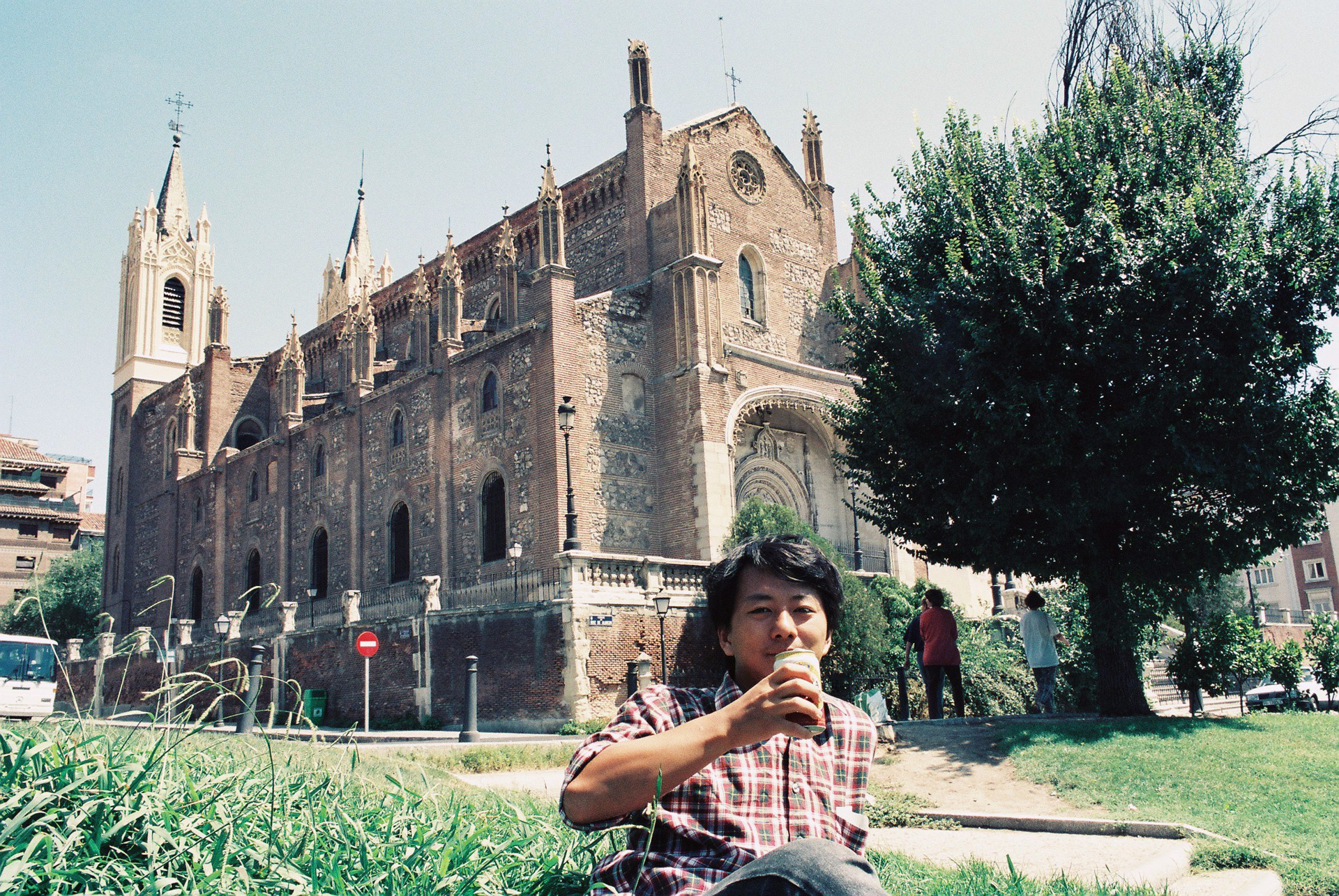 プラド美術館を見学し、近くの教会を背景にビールを飲む。